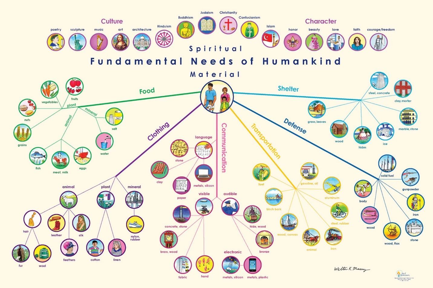 - The first chart provides a broad overview of fundamental needs, divided into material needs (food, shelter, clothing, defense, transportation) and spiritual needs (art, music, religion, communication).